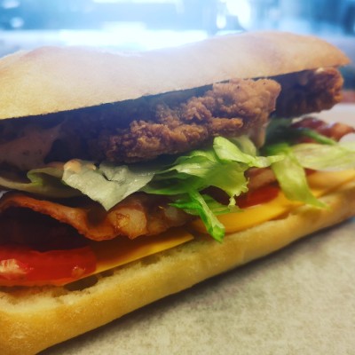 Spicy breaded chicken, House made chipotle ranch, cheddar cheese, pickled jalapenos, mac and cheese stuffed between two pieces of our signature pressed ciabatta.