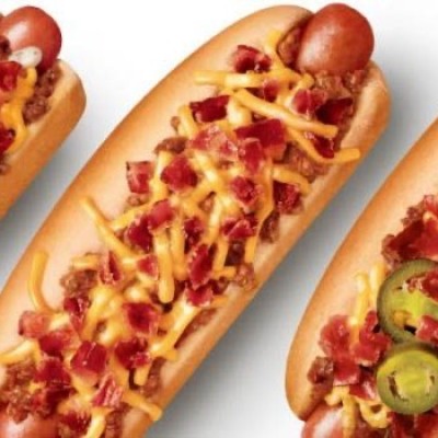Jumbo Dog topped with cheddar cheese and Drake bacon bits.