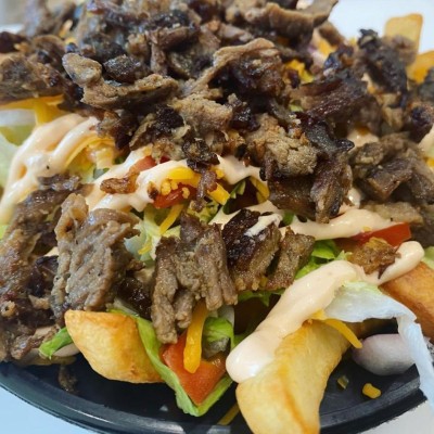 Baked fries, lettuce, tomatoes, onions, freshly grated cheddar cheese topped with AAA+ Beef & burger sauce.
